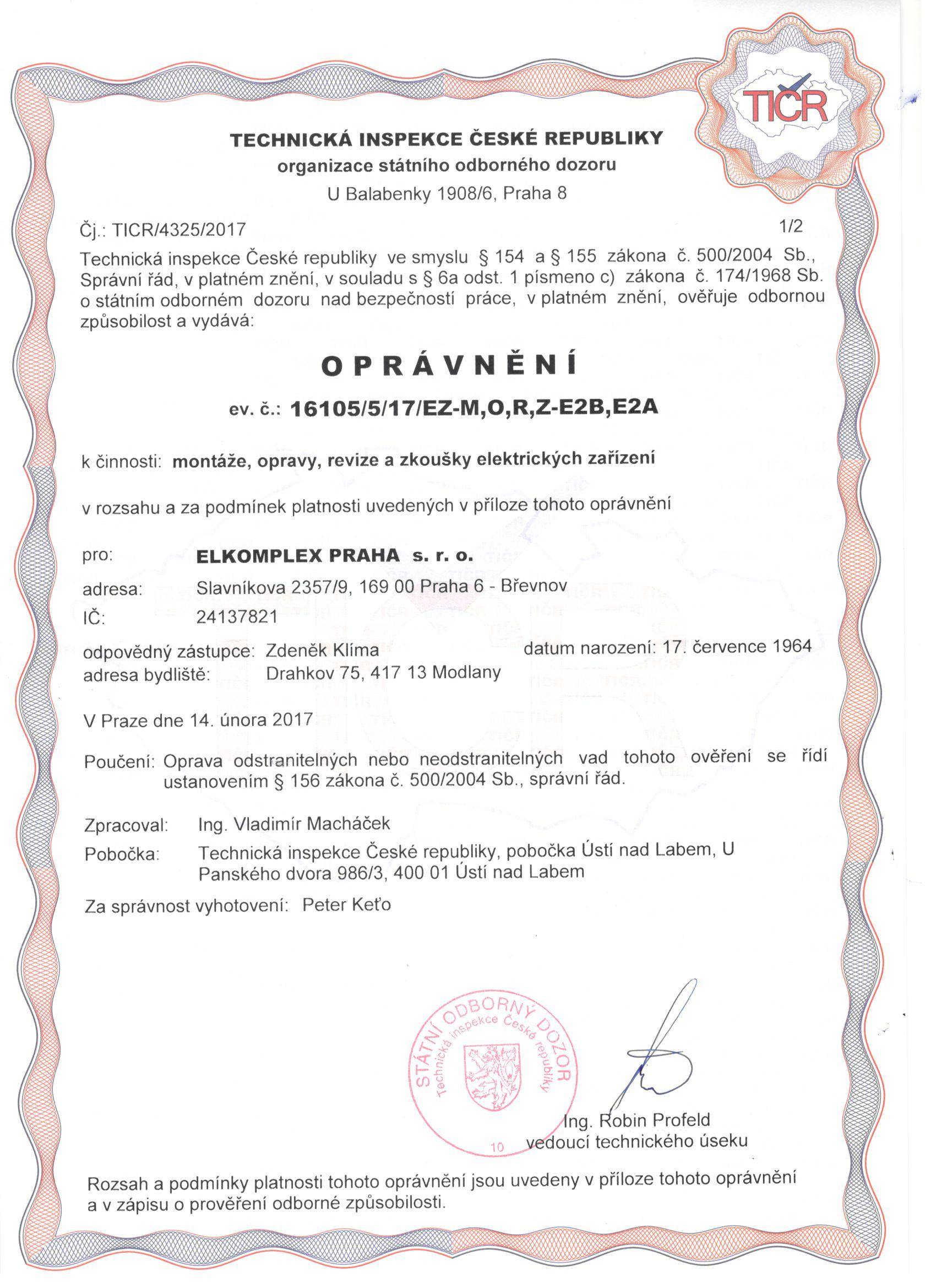 Společnost Elkomplex Praha s.r.o. vznikla v roce 2011, změnou firmy Zdeněk Klíma-Elektromontáže podnikající od roku 1994, na společnost s ručením omezeným. Sídlo společnosti je v Praze 6-Břevnov, Slavníkova 2357/9. Působnost je v rámci ČR, kde provádíme komplexní činnost v oblasti elektro a to od návrhu projektu po finální realizaci.